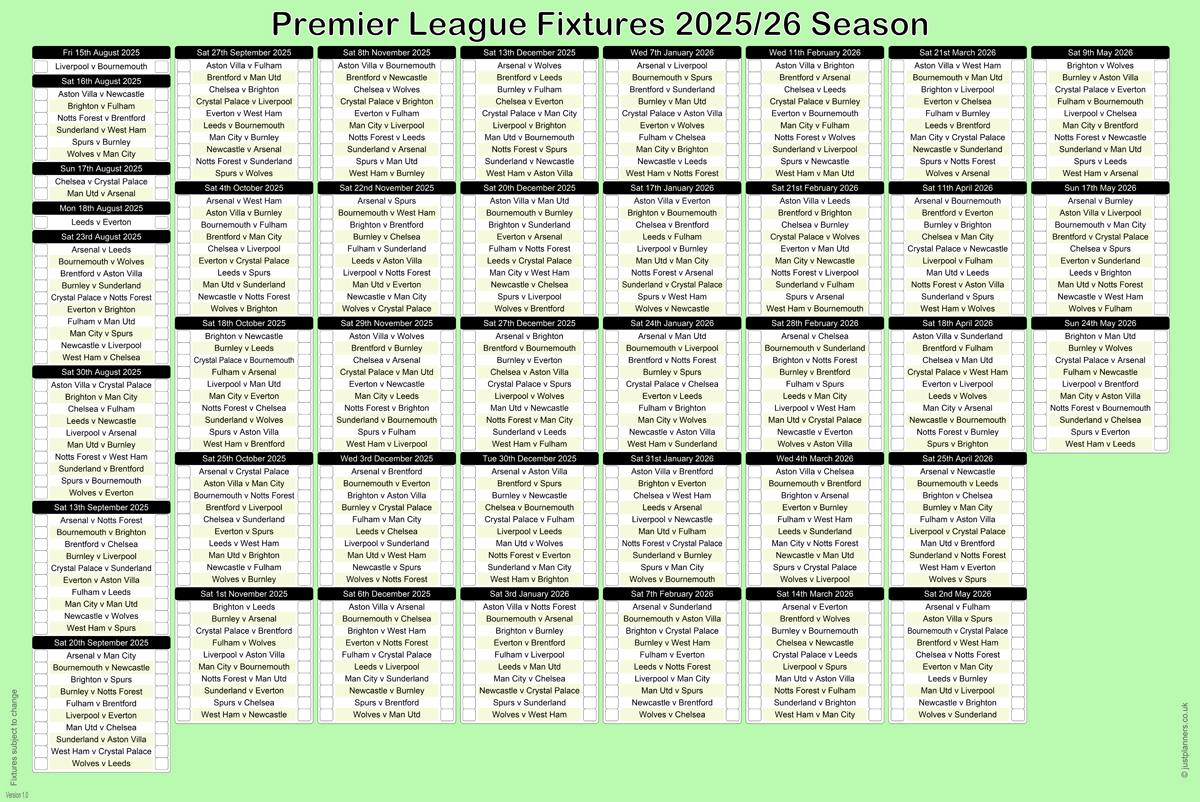 • Our Premier League planners are available in 2 styles. The first is a simple fixtures calendar list of games. The second "Team by Team" version has a panel for each of the 20 teams in the League,
